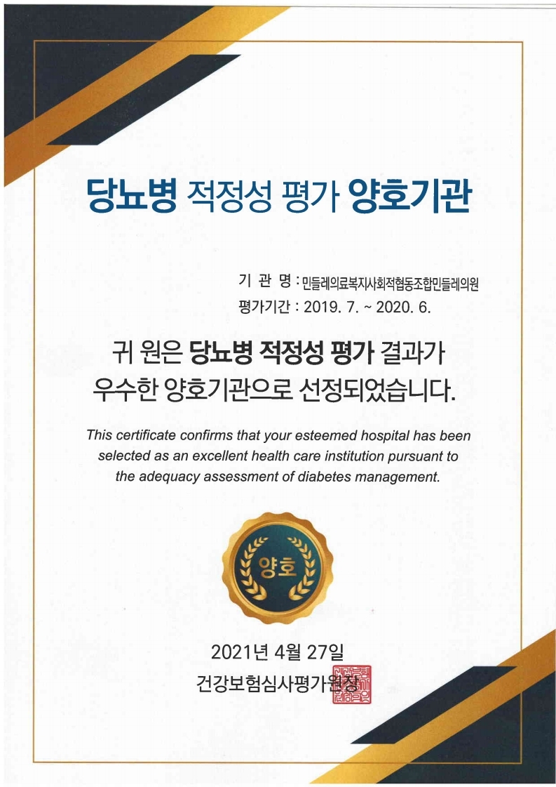 민들레의원, 만성질환 관리 양호기관으로 선정 상세내용