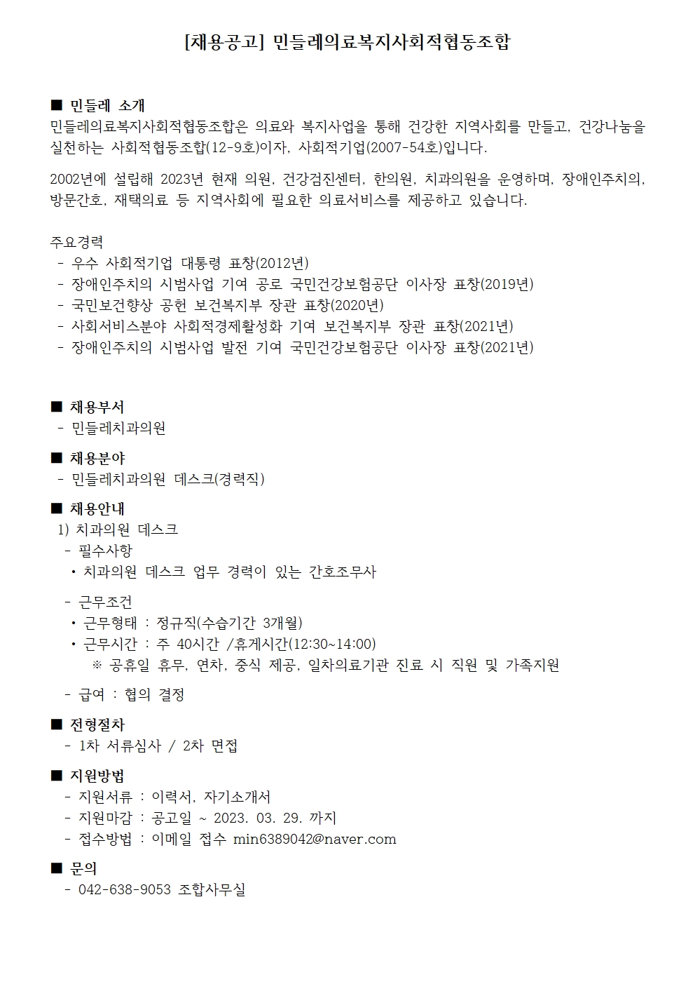 [채용마감]민들레치과의원 간호조무사 채용 상세내용