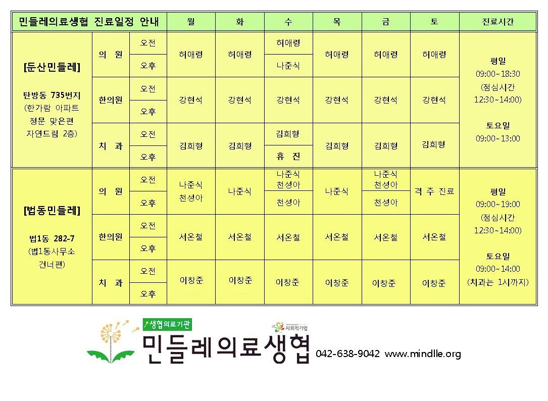 민들레 둔산, 법동 진료안내