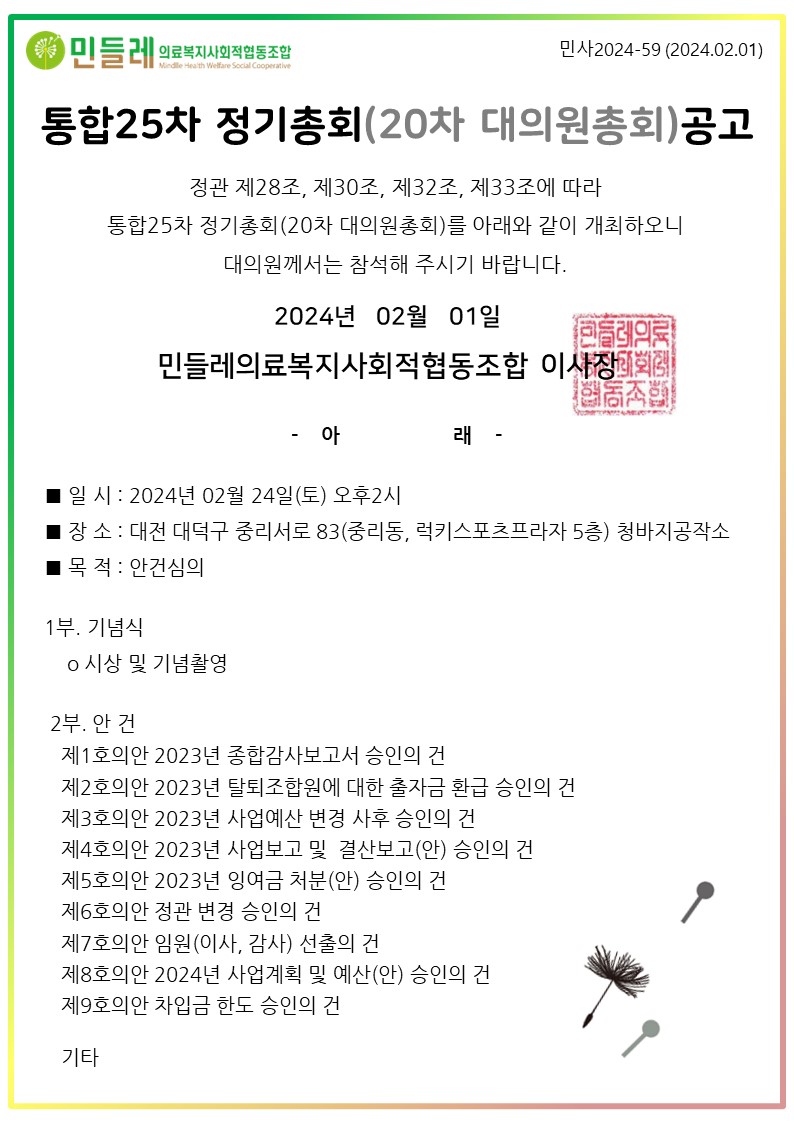 통합25차 정기총회(20차 대의원총회) 공고